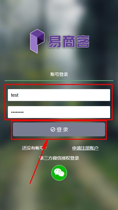 进入系统登录页面后,根据页面提示输入您的“账号”(微信号/手机号)以及“密码”(初始密码12345678,可进入系统后修改),点击“登录”按钮进入系统页面。